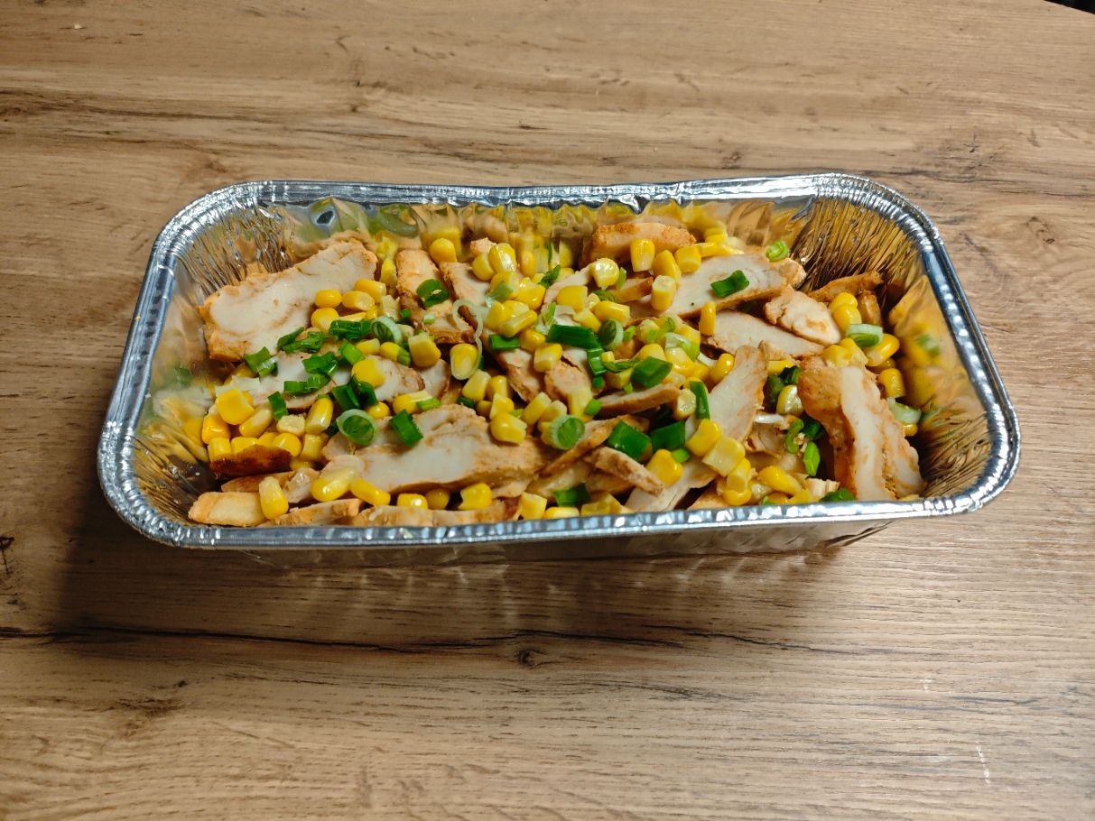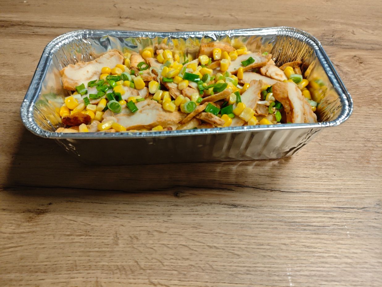 frytki 150g, filet z piersi kurczaka w przyprawach 100G, kukurydza, szczypiorek, autorski sos łagodny