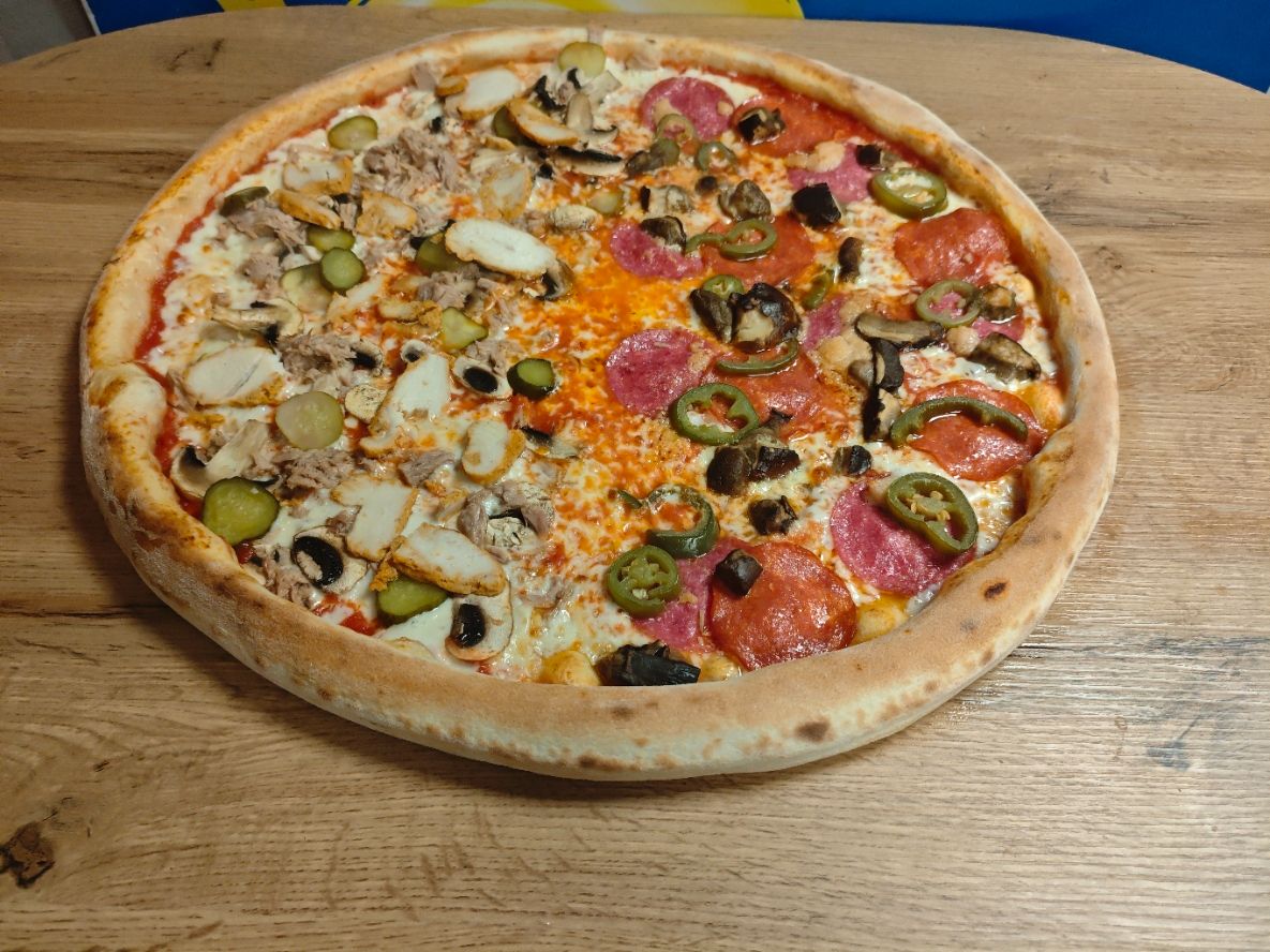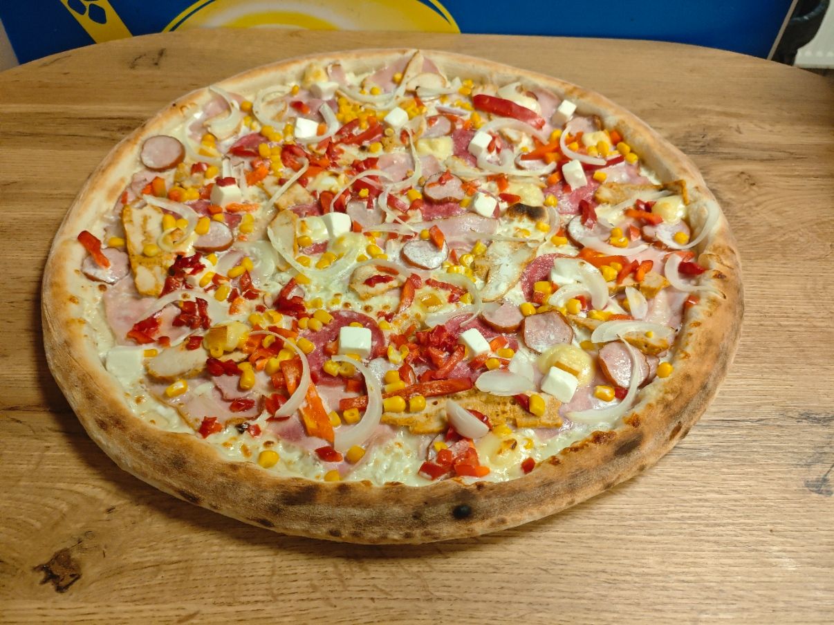 Sos, Ser Mozarella, Pieczarki, Boczek wędzony, Kurczak, Kukurydza, Pomidor Świeży, Ogórek Świeży
